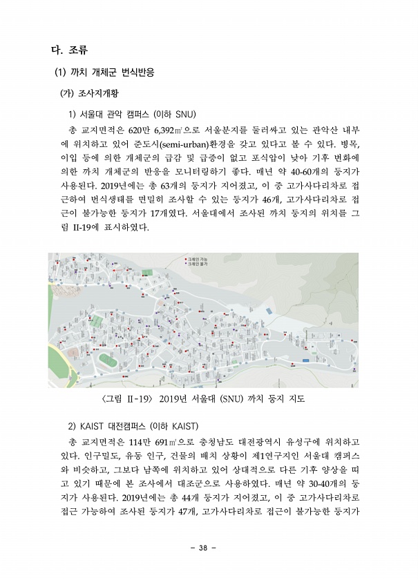 38 다. 조류 1 까치 개체군 번식반응 가 조사지개황 1 서울대 관악 캠퍼스 이하 SNU 총 교지면적은 620만 6,392㎡으로 서울분지를 둘러싸고 있는 관악산 내부 에 위치하고 있어 준도시 semi-urban 환경을 갖고 있다고 볼 수 있다. 병목, 이입 등에 의한 개체군의 급감 및 급증이 없고 포식압이 낮아 기후 변화에 의한 까치 개체군의 반응을 모니터링하기 좋다. 매년 약 40-60개의 둥지가 사용된다. 2019년에는 총 63개의 둥지가 지어졌고, 이 중 고가사다리차로 접 근하여 번식생태를 면밀히 조사할 수 있는 둥지가 46개, 고가사다리차로 접 근이 불가능한 둥지가 17개였다. 서울대에서 조사된 까치 둥지의 위치를 그 림 II-19에 표시하였다. 그림 Ⅱ-19 2019년 서울대 SNU 까치 둥지 지...