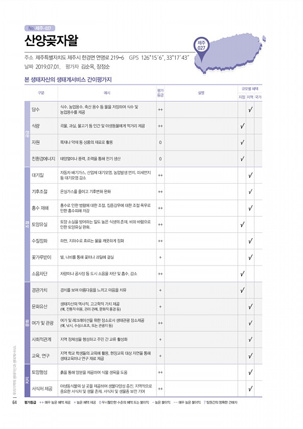 No. 제주- 제주 027 본 생태자산의 생태계서비스 간이평가지 구분 예시 평가 등급 설명 규모별 혜택 지점 지역 국가 공급 담수 식수, 농업용수, 축산 용수 등 물을 저장하여 식수 및 농업용수를 제공 ++ √ 식량 곡물, 과실, 물고기 등 인간 및 야생동물에게 먹거리 제공 ++ √ 자원 목재나 약재 등 상품의 재료로 활용 0 √ 친환경에너지 태양열이나 풍력, 조력을 통해 전기 생산 0 √ 조절 대기질 자동차 배기가스, 산업체 대기오염, 농업발생 먼지, 미세먼지 등 대기오염 감소 ++ √ 기후조절 온실가스를 줄이고 기후변화 완화 ++ √ 홍수 재해 홍수로 인한 범람에 대한 조절, 집중강우에 대한 조절 폭우로 인한 홍수피해 저감 ++ √ 토양유실 토양 소실을 방어하는 밀도 높은 식생의 존재, 비와 바람으로 인...