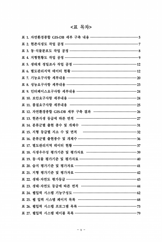 v 표 목차 표 1. 자연환경종합 GIS-DB 세부 구축 내용 ··························································5 표 2. 현존식생도 작업 공정 ························································································7 표 3. 동·식물분포도 작업 공정 ··················································································8 표 4. 지형현황도 작업 공정 ··············································································...