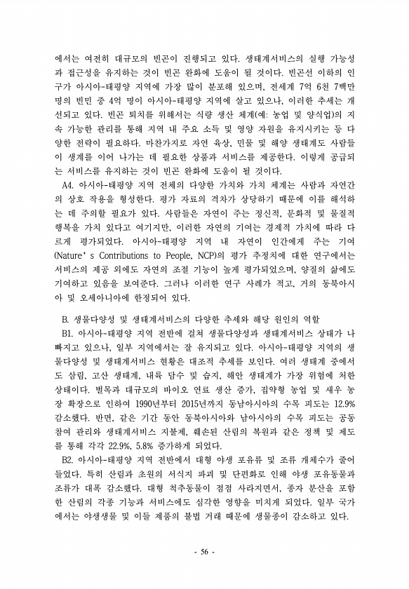 에서는 여전히 대규모의 빈곤이 진행되고 있다. 생태계서비스의 실행 가능성 과 접근성을 유지하는 것이 빈곤 완화에 도움이 될 것이다. 빈곤선 이하의 인 구가 아시아-태평양 지역에 가장 많이 분포해 있으며, 전세계 7억 6천 7백만 명의 빈민 중 4억 명이 아시아-태평양 지역에 살고 있으나, 이러한 추세는 개 선되고 있다. 빈곤 퇴치를 위해서는 식량 생산 체계 예농업 및 양식업 의 지 속 가능한 관리를 통해 지역 내 주요 소득 및 영양 자원을 유지시키는 등 다 양한 전략이 필요하다. 마찬가지로 자연 육상, 민물 및 해양 생태계도 사람들 이 생계를 이어 나가는 데 필요한 상품과 서비스를 제공한다. 이렇게 공급되 는 서비스를 유지하는 것이 빈곤 완화에 도움이 될 것이다. A4. 아시아-태평양 지역 전체의 다양한 가...