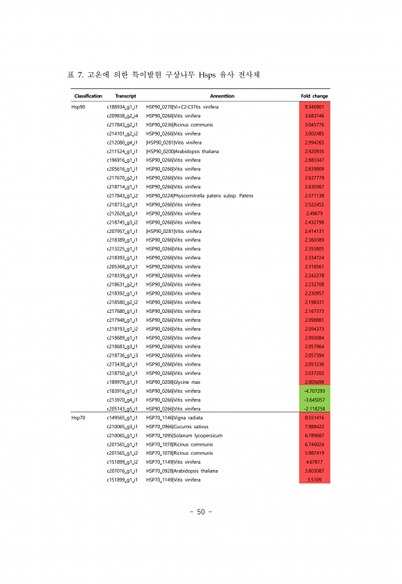 50 Classification Transcript Annonttion Fold change Hsp90 c188934_g1_i1 HSP90_0278|Vi+C2C37tis vinifera 9.346901 c209838_g2_i4 HSP90_0266|Vitis vinifera 3.683746 c217843_g2_i1 HSP90_0236|Ricinus communis 3.045776 c214101_g2_i2 HSP90_0266|Vitis vinifera 3.002485 c212080_g4_i1 |HSP90_0281|Vitis vinifera 2.994265 c211524_g1_i1 |HSP90_0200|Arabidopsis thaliana 2.920935 c196916_g1_i1 HSP90_0266|Vitis v...