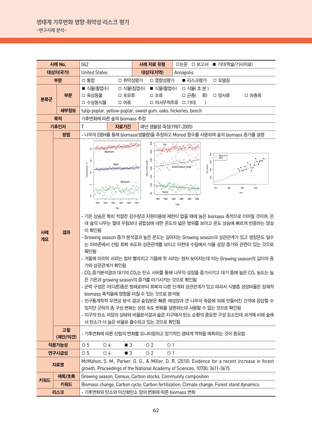 62 생태계 기후변화 영향·취약성·리스크 평가 -연구사례 분석- 사례 No. 042 사례 자료 유형 □논문 □ 보고서 ■ 기타 학술/기사자료 대상지 국가 United States 대상지 지역 Annapolis 부문 □ 통합 □ 취약성평가 □ 영향성평가 ■ 리스크평가 □ 모델링 분류군 부문 ■ 식물 활엽수 □ 식물 침엽수 ■ 식물 활엽수 □ 식물 초 본 □ 육상동물 □ 포유류 □ 조류 □ 곤충 류 □ 양서류 □ 파충류 □ 수상동식물 □ 어류 □ 저서무척추류 □ 기타 세부정보 tulip-poplar, yellow-poplar, sweet gum, oaks, hickories, beech 목적 기후변화에 따른 숲의 biomass 추정 기후인자 T 자료기간 매년 생물량 측정 1987-2005 사례 개요 방법 나무의...