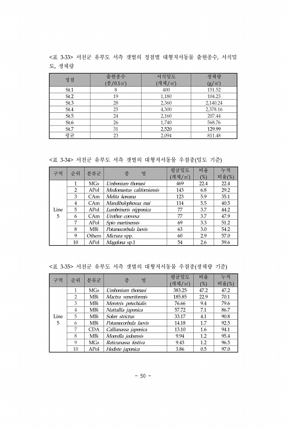 50 정점 출현종수 종/0.1㎡ 서식밀도 개체/㎡ 생체량 g/㎡ St.1 8 400 151.52 St.2 19 1,180 104.23 St.3 28 2,360 2,140.24 St.4 25 4,300 2,378.16 St.5 24 2,160 207.44 St.6 26 1,740 568.76 St.7 31 2,520 129.99 평균 23 2,094 811.48 표 3-33 서천군 유부도 서측 갯벌의 정점별 대형저서동물 출현종수, 서식밀 도, 생체량 구역 순위 분류군 종 명 평균밀도 개체/㎡ 비율 % 누적 비율 % Line 5 1 MGs Umbonium thomasi 469 22.4 22.4 2 APol Mediomastus californiensis 143 6.8 29.2 3 CAm Melita korean...