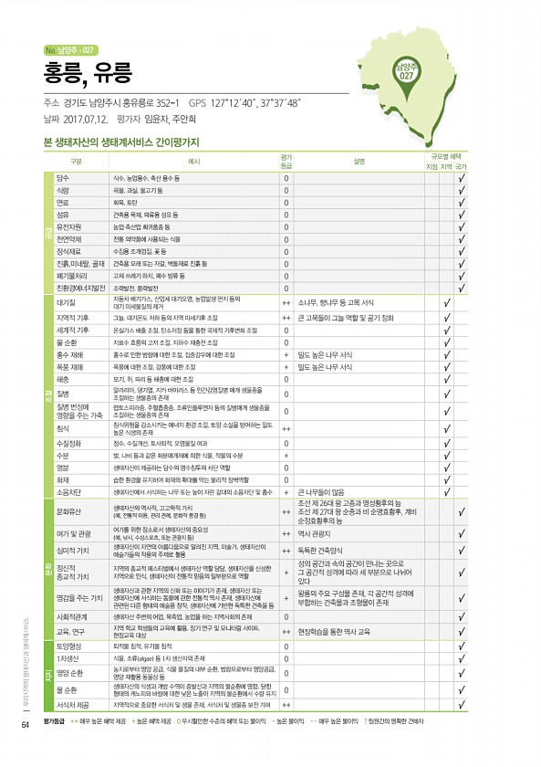 No. 남양주 남양주 027 본 생태자산의 생태계서비스 간이평가지 구분 예시 평가 등급 설명 규모별 혜택 지점 지역 국가 공급 담수 식수, 농업용수, 축산 용수 등 0 √ 식량 곡물, 과실, 물고기 등 0 √ 연료 화목, 토탄 0 √ 섬유 건축용 목재, 의류용 섬유 등 0 √ 유전자원 농업·축산업 희귀품종 등 0 √ 천연약재 전통 의약품에 사용되는 식물 0 √ 장식재료 수집용 조개껍질, 꽃 등 0 √ 진흙,미네랄, 골재 건축용 모래 또는 자갈, 벽돌재료 진흙 등 0 √ 폐기물처리 고체 쓰레기 하치, 폐수 방류 등 0 √ 친환경에너지발전 조력발전, 풍력발전 0 √ 조절 대기질 자동차 배기가스, 산업체 대기오염, 농업발생 먼지 등의 대기 미세물질의 제거 ++ 소나무, 향나무 등 고목 서식 √ 지역적 기후 그늘,...