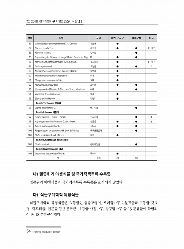2018 전국해안사구 자연환경조사 전남Ⅰ 54 ? National Institute of Ecology 멸종위기 야생식물과 국가적색목록 수록종은 조사되지 않았다. 식물구계학적 특정식물은 Ⅳ등급인 층층고랭이, 후피향나무 2 분류군과 Ⅲ등급 갯그 령, 쥐꼬리풀, 천문동 등 3 분류군, Ⅰ등급 사철나무, 장구밥나무 등 13 분류군이 확인되 어 총 18 분류군이었다. 번호 학명 국명 해빈-전사구 배후삼림 비고 83 Cymbopogon goeringii Steud. A. Camus 개솔새 ● 84 Elymus mollis Trin. 갯그령 ● ● Ⅲ, 사구 85 Festuca ovina L. 김의털 ● 86 Imperata cylindrica var. koenigii Retz. Benth. ex Pilg. 띠 ● ●...
