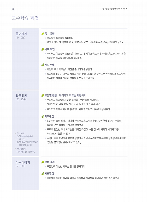 교수학습 과정 들어가기 510분 동기 유발 ● 우리학교 학교숲을 살펴본다. 학교숲 사진 제시 역할, 위치, 학교숲의 규모, 식재된 나무의 종류, 생물다양성 등 목표 확인 ● 우리학교 학교숲의 중요성을 이해하고, 우리학교 학교숲의 가치를 홍보하는 안내문을 작성하여 학교숲 보전태도를 함양한다. 지도관점 ● 사전에 교내 학교숲의 사진을 준비하여 활용한다. ● 학교숲에 심어진 나무와 식물의 종류, 생물 다양성 및 주변 자연환경에 따라 학교숲이 제공하는 혜택에 차이가 발생할 수 있음을 고려한다. 활동하기 2025분 모둠별 활동 우리학교 학교숲 자랑하기 ● 우리학교 학교숲에서 받는 혜택을 구체적으로 적어본다. 생물다양성, 교육 장소, 대기질 조절, 경관미 등 요소 고려 ● 우리학교 학교숲 가치를 홍보하기 위한 학교숲 ...
