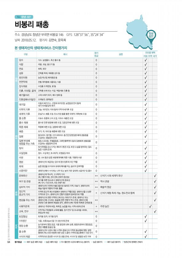 No. 창녕- 창녕 027 본 생태자산의 생태계서비스 간이평가지 구분 예시 평가 등급 설명 규모별 혜택 지점 지역 국가 공급 담수 식수, 농업용수, 축산 용수 등 0 √ 식량 곡물, 과실, 물고기 등 0 √ 연료 화목, 토탄 0 √ 섬유 건축용 목재, 의류용 섬유 등 0 √ 유전자원 농업·축산업 희귀품종 등 0 √ 천연약재 전통 의약품에 사용되는 식물 0 √ 장식재료 수집용 조개껍질, 꽃 등 0 √ 진흙, 미네랄, 골재 건축용 모래 또는 자갈, 벽돌재료 진흙 등 0 √ 폐기물처리 고체 쓰레기 하치, 폐수 방류 등 0 √ 친환경에너지발전 조력발전, 풍력발전 0 √ 조절 대기질 자동차 배기가스, 산업체 대기오염, 농업발생 먼지 등의 대기 미세물질의 제거 0 √ 지역적 기후 그늘, 대기온도 저하 등의 지역 미세기...