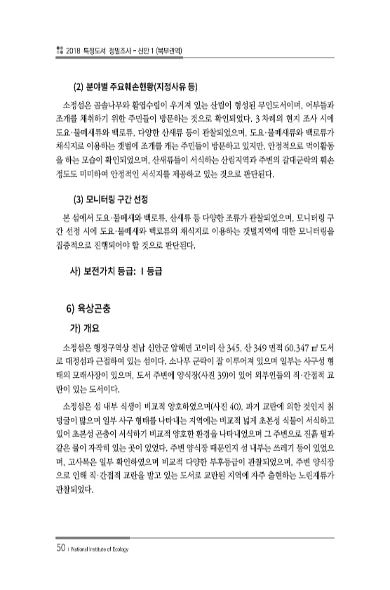 2018 특정도서 정밀조사 신안 1 북부권역 50 ? National Institute of Ecology 2 소정섬은 곰솔나무와 활엽수림이 우거져 있는 산림이 형성된 무인도서이며, 어부들과 조개를 채취하기 위한 주민들이 방문하는 것으로 확인되었다. 3 차례의 현지 조사 시에 도요·물떼새류와 백로류, 다양한 산새류 등이 관찰되었으며, 도요·물떼새류와 백로류가 채식지로 이용하는 갯벌에 조개를 캐는 주민들이 방문하고 있지만, 안정적으로 먹이활동 을 하는 모습이 확인되었으며, 산새류들이 서식하는 산림지역과 주변의 갈대군락의 훼손 정도도 미미하여 안정적인 서식지를 제공하고 있는 것으로 판단된다. 3 본 섬에서 도요·물떼새와 백로류, 산새류 등 다양한 조류가 관찰되었으며, 모니터링 구 간 선정 시에 도요·물떼새와 백...