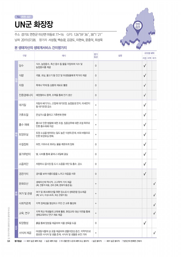No. 연천- 연천 027 본 생태자산의 생태계서비스 간이평가지 구분 예시 평가 등급 설명 규모별 혜택 지점 지역 국가 공급 담수 식수, 농업용수, 축산 용수 등 물을 저장하여 식수 및 농업용수를 제공 0 √ 식량 곡물, 과실, 물고기 등 인간 및 야생동물에게 먹거리 제공 0 √ 자원 목재나 약재 등 상품의 재료로 활용 0 √ 친환경에너지 태양열이나 풍력, 조력을 통해 전기 생산 0 √ 조절 대기질 자동차 배기가스, 산업체 대기오염, 농업발생 먼지, 미세먼지 등 대기오염 감소 + √ 기후조절 온실가스를 줄이고 기후변화 완화 + √ 홍수 재해 홍수로 인한 범람에 대한 조절, 집중강우에 대한 조절 폭우로 인한 홍수피해 저감 + √ 토양유실 토양 소실을 방어하는 밀도 높은 식생의 존재, 비와 바람으로 인한 토양유...
