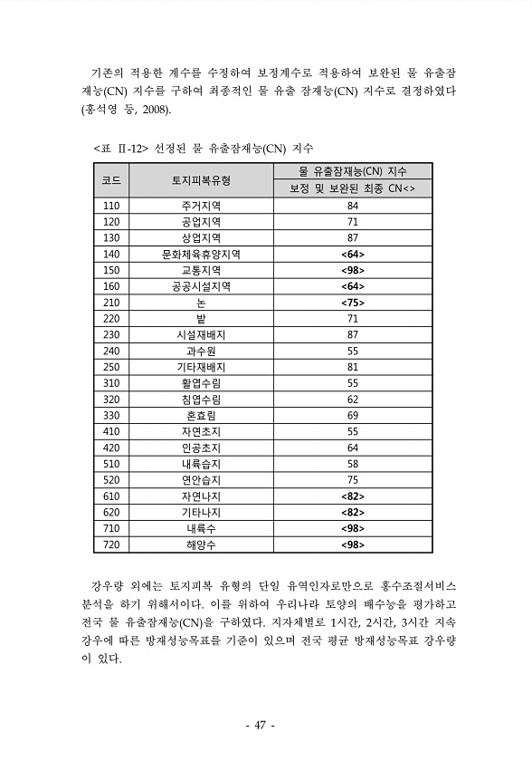 기존의 적용한 계수를 수정하여 보정계수로 적용하여 보완된 물 유출잠 재능 지수를 구하여 최종적인 물 유출 잠재능 지수로 결정하였다 홍석영 등 코드 토지피복유형 물 유출잠재능 CN 지수 보정 및 보완된 최종 CN 110 주거지역 84 120 공업지역 71 130 상업지역 87 140 문화체육휴양지역 64 150 교통지역 98 160 공공시설지역 64 210 논 75 220 밭 71 230 시설재배지 87 240 과수원 55 250 기타재배지 81 310 활엽수림 55 320 침엽수림 62 330 혼효림 69 410 자연초지 55 420 인공초지 64 510 내륙습지 58 520 연안습지 75 610 자연나지 82 620 기타나지 82 710 내륙수 98 720 해양수 98 표 선정된 물 유출잠재능 지수 강우량...