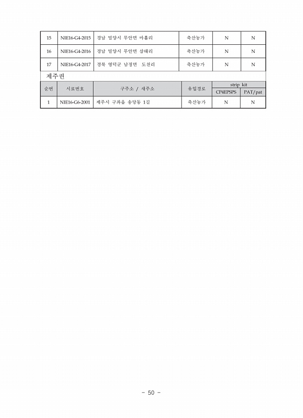15 NIE16-G4-2015 경남 밀양시 무안면 마흘리 축산농가 N N 16 NIE16-G4-2016 경남 밀양시 무안면 삼태리 축산농가 N N 17 NIE16-G4-2017 경북 영덕군 남정면 도천리 축산농가 N N 제주권 순번 시료번호 구주소 새주소 유입경로 strip kit CP4EPSPS PAT/pat 1 NIE16-G6-2001 제주시 구좌읍 송당동 1길 축산농가 NN