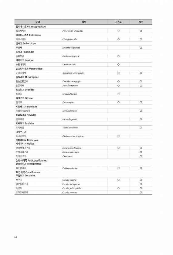 64 할미새사촌과 Campephagidae 할미새사촌 Pericrocotus divaricatus ○ ○ 개개비사촌과 Cisticolidae 개개비사촌 Cisticola juncidis ○ ○ 멧새과 Emberizidae 무당새 Emberiza sulphurata ○ 되새과 Fringillidae 밀화부리 Eophona migratoria ○ 때까치과 Laniidae 노랑때까치 Lanius cristatus ○ 긴꼬리딱새과 Monarchidae 긴꼬리딱새 Terpsiphone atrocaudata ○ ○ 솔딱새과 Muscicapidae 흰눈썹황금새 Ficedula zanthopygia ○ ○ 검은딱새 Saxicola torquatus ○ ○ 꾀꼬리과 Oriolidae 꾀꼬리 Oriolus chinensis ...