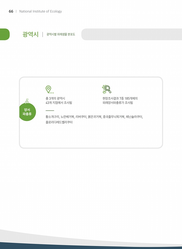 광역시 광역시별 외래생물 분포도 총 3개의 광역시 43개 지점에서 조사됨 현장조사결과 7종 185개체의 외래양서파충류가 조사됨 황소개구리, 노란배거북, 리버쿠터, 붉은귀거북, 중국줄무늬목거북, 페닌슐라쿠터, 플로리다레드벨리쿠터 양서 파충류 66 National Institute ofEcology