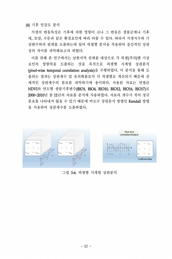52 기후 민감도 분석 식생의 변동특성은 기후에 의한 영향이 크나 그 반응은 생물군계나 기후 대 토양 수문과 같은 환경요인에 따라 다를 수 있다 따라서 식생지수와 기 상변수와의 관계를 도출하는데 있어 픽셀별 분석을 적용하여 공간적인 상관 성의 차이를 파악해보고자 하였다 이를 위해 본 연구에서는 남한지역 전체를 대상으로 각 픽셀 격자 별 기상 요인의 영향력을 도출하는 것을 목적으로 픽셀별 시계열 상관분석 을 수행하였다 이 분석을 통해 도 출되는 결과는 상관계수 및 유의확률로서 각 픽셀별로 계산되기 때문에 전 체적인 상관계수의 분포를 파악하기에 용이하다 사용된 자료는 연평균 와 연도별 생물기후변수 로 년 총 년의 자료를 분석에 사용하였다 자료의 개수가 적어 정규 분포를 나타내지 않을 수 있기 때문에 비모수 상관...