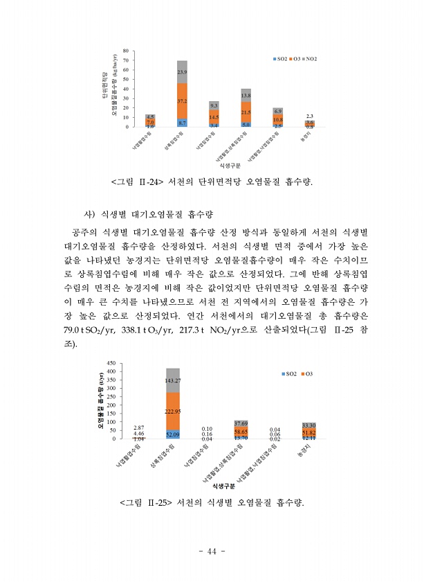 44 그림 서천의 단위면적당 오염물질 흡수량 사 식생별 대기오염물질 흡수량 공주의 식생별 대기오염물질 흡수량 산정 방식과 동일하게 서천의 식생별 대기오염물질 흡수량을 산정하였다 서천의 식생별 면적 중에서 가장 높은 값을 나타냈던 농경지는 단위면적당 오염물질흡수량이 매우 작은 수치이므 로 상록침엽수림에 비해 매우 작은 값으로 산정되었다 그에 반해 상록침엽 수림의 면적은 농경지에 비해 작은 값이었지만 단위면적당 오염물질 흡수량 이 매우 큰 수치를 나타냈으므로 서천 전 지역에서의 오염물질 흡수량은 가 장 높은 값으로 산정되었다 연간 서천에서의 대기오염물질 총 흡수량은 으로 산출되었다 그림 참 조 그림 서천의 식생별 오염물질흡수량