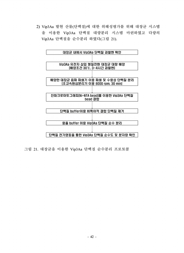 42 2 Vip3Aa 발현 산물 단백질 에 대한 위해성평가를 위해 대장균 시스템 을 이용한 Vip3Aa 단백질 대량분리 시스템 마련하였고 다량의 Vip3Aa 단백질을 순수분리 하였다 그림 21 그림 21. 대장균을 이용한 Vip3Aa 단백질 순수분리프로토콜