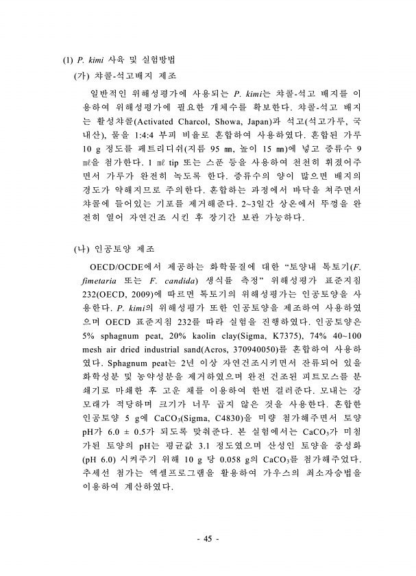 45 1 P. kimi 사육 및 실험방법 가 챠콜-석고배지 제조 일반적인 위해성평가에 사용되는 P. kimi는 챠콜-석고 배지를 이 용하여 위해성평가에 필요한 개체수를 확보한다. 챠콜-석고 배지 는 활성챠콜 Activated Charcol, Showa, Japan 과 석고 석고가루, 국 내산 , 물을 144 부피 비율로 혼합하여 사용하였다. 혼합된 가루 10 g 정도를 페트리디쉬 지름 95 ㎜, 높이 15 ㎜ 에 넣고 증류수 9 ㎖을 첨가한다. 1 ㎖ tip 또는 스푼 등을 사용하여 천천히 휘졌어주 면서 가루가 완전히 녹도록 한다. 증류수의 양이 많으면 배지의 경도가 약해지므로 주의한다. 혼합하는 과정에서 바닥을 쳐주면서 챠콜에 들어있는 기포를 제거해준다. 23일간 상온에서 뚜껑을 완 전히 열어 자연건조 시...