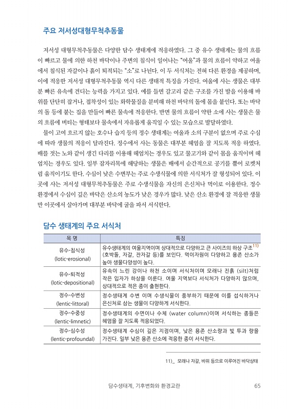 담수생태계, 기후변화와 환경교란 65 주요 저서성대형무척추동물 저서성 대형무척추동물은 다양한 담수 생태계에 적응하였다. 그 중 유수 생태계는 물의 흐름 이 빠르고 물에 의한 하천 바닥이나 주변의 침식이 일어나는 “여울”과 물의 흐름이 약하고 여울 에서 침식된 자갈이나 흙이 퇴적되는 “소”로 나뉜다. 이 두 서식처는 전혀 다른 환경을 제공하며, 이에 적응한 저서성 대형무척추동물 역시 다른 생태적 특징을 가진다. 여울에 사는 생물은 대부 분 빠른 유속에 견디는 능력을 가지고 있다. 예를 들면 갈고리 같은 구조를 가진 발을 이용해 바 위를 단단히 잡거나, 접착성이 있는 화학물질을 분비해 하천 바닥의 돌에 몸을 붙인다. 또는 바닥 의 돌 등에 붙는 집을 만들어 빠른 물속에 적응한다. 반면 물의 흐름이 약한 소에 사...