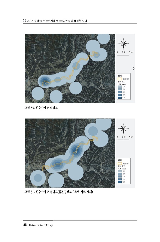 2018 생태·경관 우수지역 발굴조사 경북 내성천 일대 56 ? National Institute of Ecology 그림 30. 흰수마자 커널밀도 그림 31. 흰수마자 커널밀도 물환경정보시스템 자료 제외