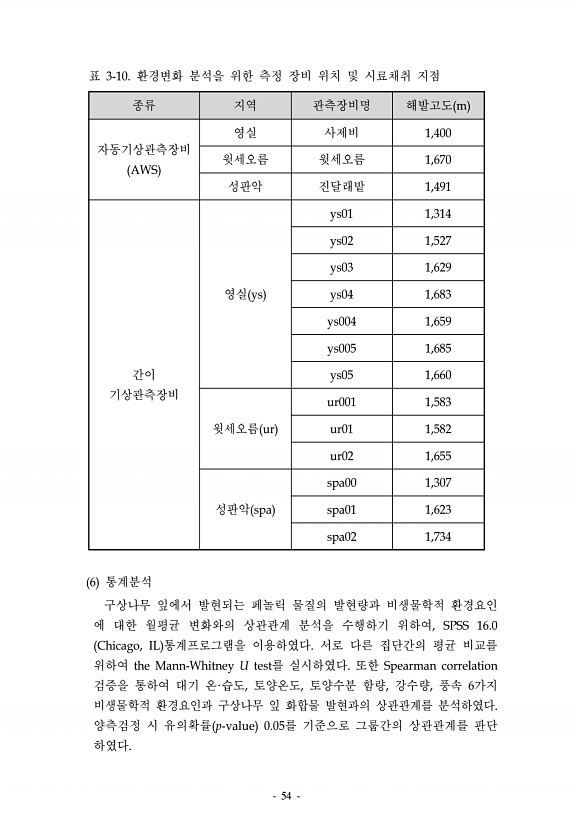 54 종류 지역 관측장비명 해발고도 m 자동기상관측장비 AWS 영실 사제비 1,400 윗세오름 윗세오름 1,670 성판악 진달래밭 1,491 간이 기상관측장비 영실 ys ys01 1,314 ys02 1,527 ys03 1,629 ys04 1,683 ys004 1,659 ys005 1,685 ys05 1,660 윗세오름 ur ur001 1,583 ur01 1,582 ur02 1,655 성판악 spa spa00 1,307 spa01 1,623 spa02 1,734 표 3-10. 환경변화 분석을 위한 측정 장비 위치 및 시료채취 지점 6 통계분석 구상나무 잎에서 발현되는 페놀릭 물질의 발현량과 비생물학적 환경요인 에 대한 월평균 변화와의 상관관계 분석을 수행하기 위하여, SPSS 16.0 Chicago, IL 통...