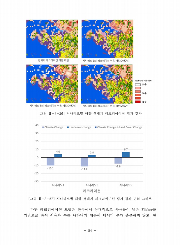 54 [그림 Ⅱ-3-26] 시나리오별 해양 생태계 레크리에이션 평가 결과 [그림 Ⅱ-3-27] 시나리오별 해양 생태계 레크리에이션 평가 결과 변화 그래프 다만 레크리에이션 모델은 한국에서 상대적으로 사용률이 낮은 Flicker를 기반으로 하여 이용자 수를 나타내기 때문에 데이터 수가 충분하지 않고,현
