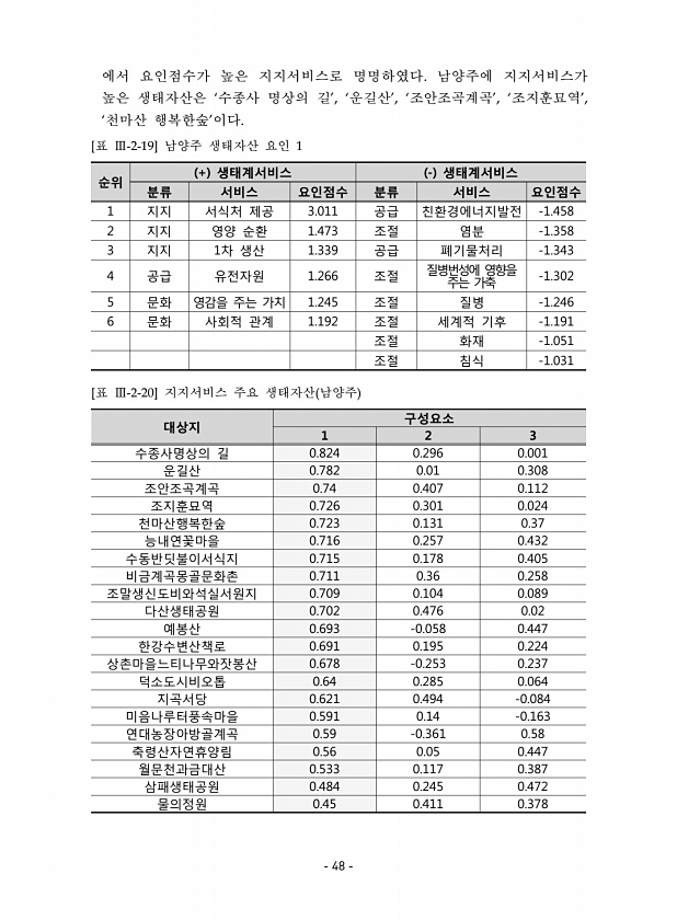 에서 요인점수가 높은 지지서비스로 명명하였다. 남양주에 지지서비스가 높은 생태자산은 ‘수종사 명상의 길’, ‘운길산’, ‘조안조곡계곡’, ‘조지훈묘역’, ‘천마산 행복한숲’이다. 순위 + 생태계서비스 생태계서비스 분류 서비스 요인점수 분류 서비스 요인점수 1 지지 서식처 제공 3.011 공급 친환경에너지발전 -1.458 2 지지 영양 순환 1.473 조절 염분 -1.358 3 지지 1차 생산 1.339 공급 폐기물처리 -1.343 4 공급 유전자원 1.266 조절 질병번성에 영향을 주는 가축 -1.302 5 문화 영감을 주는 가치 1.245 조절 질병 -1.246 6 문화 사회적 관계 1.192 조절 세계적 기후 -1.191 조절 화재 -1.051 조절 침식 -1.031 [표 Ⅲ-2-19] 남양주 생태자산 ...