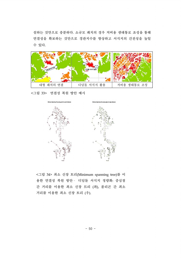50 설하는 것만으로 충분하다. 소규모 패치의 경우 저비용 생태통로 조성을 통해 연결성을 확보하는 것만으로 경관지수를 향상하고 서식지의 건전성을 높일 수 있다. 대형 패치의 연결 디딤돌 서식지 활용 저비용 생태통로 조성 그림 33 연결성 복원 방안 예시 그림 34 최소 신장 트리 Minimum spanning tree 를 이 용한 연결성 복원 방안? 디딤돌 서식지 정량화중심점 간 거리를 이용한 최소 신장 트리 좌 , 폴리곤 간 최소 거리를 이용한 최소 신장 트리 우