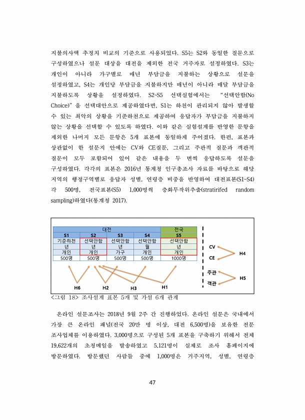 47 지불의사액 추정치 비교의 기준으로 사용되었다. S5는 S2와 동일한 질문으로 구성하였으나 설문 대상을 대전을 제외한 전국 거주자로 설정하였다. S3는 개인이 아니라 가구별로 매년 부담금을 지불하는 상황으로 설문을 설정하였고, S4는 개인당 부담금을 지불하지만 매년이 아니라 매달 부담금을 지불하도록 상황을 설정하였다. S2S5 선택실험에서는 “선택안함 No Choice ” 을 선택대안으로 제공하였다면, S1는 하천이 관리되지 않아 발생할 수 있는 최악의 상황을 기준하천으로 제공하여 응답자가 부담금을 지불하지 않는 상황을 선택할 수 있도록 하였다. 이와 같은 실험설계를 반영한 문항을 제외한 나머지 모든 문항은 5개 표본에 동일하게 주어졌다. 한편, 표본과 상관없이 한 설문지 안에는 CV와 CE질문, 그리고...