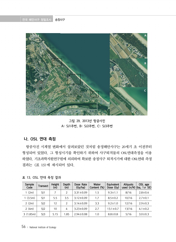 전국 해안사구 정밀조사 송정사구 56 ? National Institute of Ecology 그림 29. 2013년 항공사진 ASJ1주변, BSJ2주변, CSJ3주변 나. OSL 연대 측정 항공사진 시계열 변화에서 살펴보았던 것처럼 송정해안사구는 20세기 초 이전부터 형성되어 있었다. 그 형성시기를 확인하기 위하여 사구퇴적물의 OSL연대측정을 이용 하였다. 기초과학지원연구원에 의뢰하여 확보한 송정사구 퇴적시기에 대한 OSL연대 측정 결과는 표 13 에 제시되어 있다. Sample Code Transect Height m Depth m Dose Rate Gy/ka Content % Water Equivalent Dose Gy used n/N Aliquots ka, 1σ SE OSL age 1 2m SJ1 7...