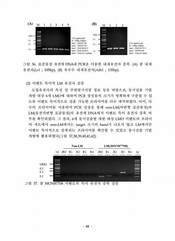 48 그림 36. 표준물질 유전체 DNA내 PCR을 이용한 내재유전자 증폭. A 콩 내재 유전자 Le1 ; 105bp , B 옥수수 내재유전자 Adh1 ; 135bp 2 이벤트 특이적 LM 유전자 검증 도입유전자의 특성 및 주변염기서열 정보 등을 바탕으로, 동시검출 기법 개발 대상 6개 LMO에 대하여 PCR 생성물의 크기가 명확하게 구분될 수 있 도록 이벤트 특이적으로 검출 가능한 프라이머를 다수 제작하였다. 이어, 다 수의 프라이머를 이용하여 PCR 검정을 통해 non-LM 비변형 표준물질 과 LM 유전자변형 표준물질 의 유전체 DNA에서 이벤트 특이 유전자 증폭 여 부를 확인하였다. 그 결과, 6개 동시검출법 개발 대상 LMO 이벤트의 프라이 머 세트에서 non-LM에서는 target 크기의 band가...
