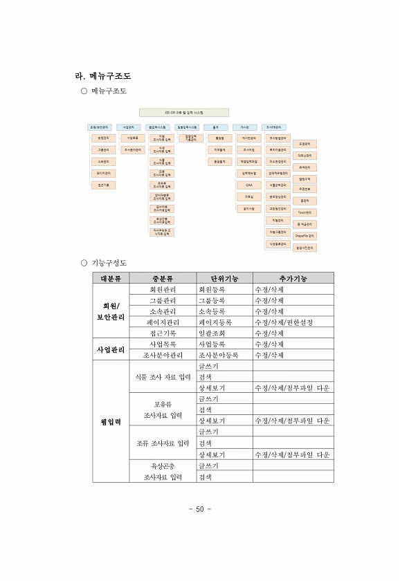 50 대분류 중분류 단위기능 추가기능 회원/ 보안관리 회원관리 회원등록 수정/삭제 그룹관리 그룹등록 수정/삭제 소속관리 소속등록 수정/삭제 페이지관리 페이지등록 수정/삭제/권한설정 접근기록 일괄조회 수정/삭제 사업관리 사업목록 사업등록 수정/삭제 조사분야관리 조사분야등록 수정/삭제 웹입력 식물 조사 자료 입력 글쓰기 검색 상세보기 수정/삭제/첨부파일 다운 포유류 조사자료 입력 글쓰기 검색 상세보기 수정/삭제/첨부파일 다운 조류 조사자료 입력 글쓰기 검색 상세보기 수정/삭제/첨부파일 다운 육상곤충 조사자료 입력 글쓰기 검색 라. 메뉴구조도 ○ 메뉴구조도 ○기능구성도