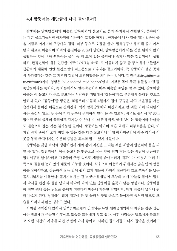 기후변화와 연안생물, 육상동물의 생존전략 65 4.4 짱뚱어는 새만금에 다시 돌아올까? 짱뚱어는 말뚝망둥어와 비슷한 망둑어과의 물고기로 물과 육지에서 생활한다. 물속에서 는 다른 물고기들처럼 아가미를 이용하여 호흡을 하지만, 공기중에 나와 있을 때는 입속에 물 을 머금고 아가미와 구강내의 점막, 피부 등으로 호흡을 한다. 말뚝망둥어에 비해 몸이 커서 탕의 재료로 이용되며 어미의 몸길이는 20㎝에 달한다. 말뚝망둥어가 마른 갯벌 위에서 많이 생활하는 것에 비해 짱뚱어는 물이 좀 더 고여 있는 웅덩이나 습기가 많은 갯벌위에서 생활 하고, 환경변화에 매우 민감한 어류이다 그림 4-5 또 이동하지 않고 한 장소에서 머물면서 생활하기 때문에 연안 환경오염의 지표종으로 이용되는 물고기이다. 즉 짱뚱어가 살던 곳에 서 ...