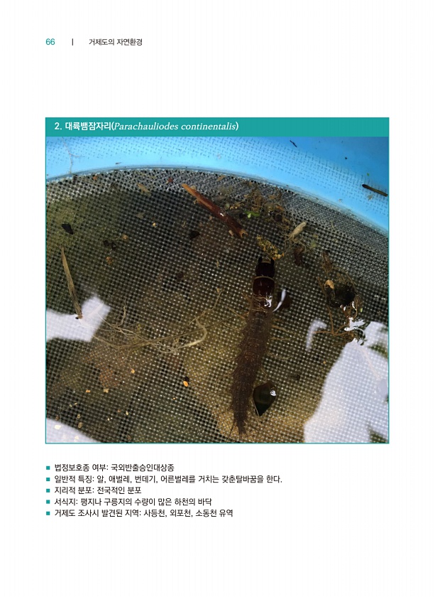 66 ┃ 거제도의 자연환경 2. 대륙뱀잠자리 Parachauliodes continentalis ■ 법정보호종 여부국외반출승인대상종 ■ 일반적 특징알, 애벌레, 번데기, 어른벌레를 거치는 갖춘탈바꿈을 한다. ■ 지리적 분포전국적인 분포 ■ 서식지평지나 구릉지의 수량이 많은 하천의 바닥 ■ 거제도 조사시 발견된 지역사등천, 외포천, 소동천유역
