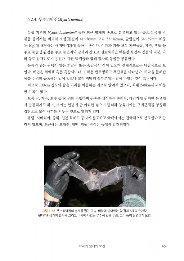 박쥐의 생태와 보전 65 6.2.4. 우수리박쥐 Myotis pentax 유럽 지역의 Myotis daubentonii 종과 최근 별개의 종으로 분류되고 있는 종으로 국내 박 쥐들 중에서는 비교적 소형 몸길이 4156mm 꼬리 3342mm, 앞발길이 3439mm 체중 510g 에 해당하는 애귀박쥐과에 속하는 종이다. 여름과 겨울 모두 자연동굴, 폐광, 갱도 등 주로 동굴성 환경을 주로 동면지와 잠자리 장소로 선호하지만 여름철의 경우 건물의 지붕, 다 리 등도 잠자리로 이용된다. 다른 박쥐들과 함께 잠자리 동굴을 공유한다. 등쪽의 털은 광택이 있는 회갈색 또는 흑갈색이 섞여 있으며 전체적으로는 담갈색으로 보 인다. 배면은 회백색 혹은 흑갈색이다. 비막은 반투명하고 흑갈색을 나타낸다. 비막을 둘러싼 몸통 주위의...