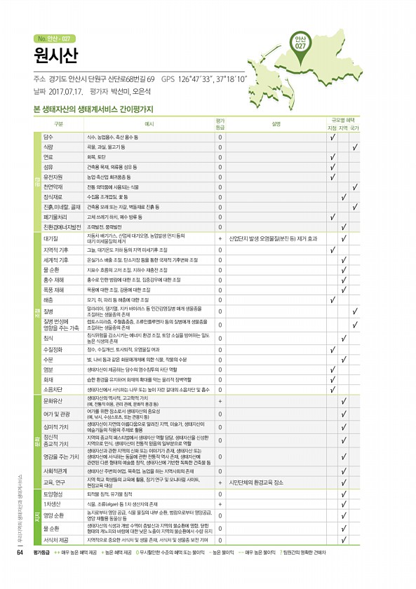 No. 안산 안산 027 본 생태자산의 생태계서비스 간이평가지 구분 예시 평가 등급 설명 규모별 혜택 지점 지역 국가 공급 담수 식수, 농업용수, 축산 용수 등 0 √ 식량 곡물, 과실, 물고기 등 0 √ 연료 화목, 토탄 0 √ 섬유 건축용 목재, 의류용 섬유 등 0 √ 유전자원 농업·축산업 희귀품종 등 0 √ 천연약재 전통 의약품에 사용되는 식물 0 √ 장식재료 수집용 조개껍질, 꽃 등 0 √ 진흙,미네랄, 골재 건축용 모래 또는 자갈, 벽돌재료 진흙 등 0 √ 폐기물처리 고체 쓰레기 하치, 폐수 방류 등 0 √ 친환경에너지발전 조력발전, 풍력발전 0 √ 조절 대기질 자동차 배기가스, 산업체 대기오염, 농업발생 먼지 등의 대기 미세물질의 제거 + 산업단지 발생 오염물질 분진 등 제거 효과 √ 지역적 기후...
