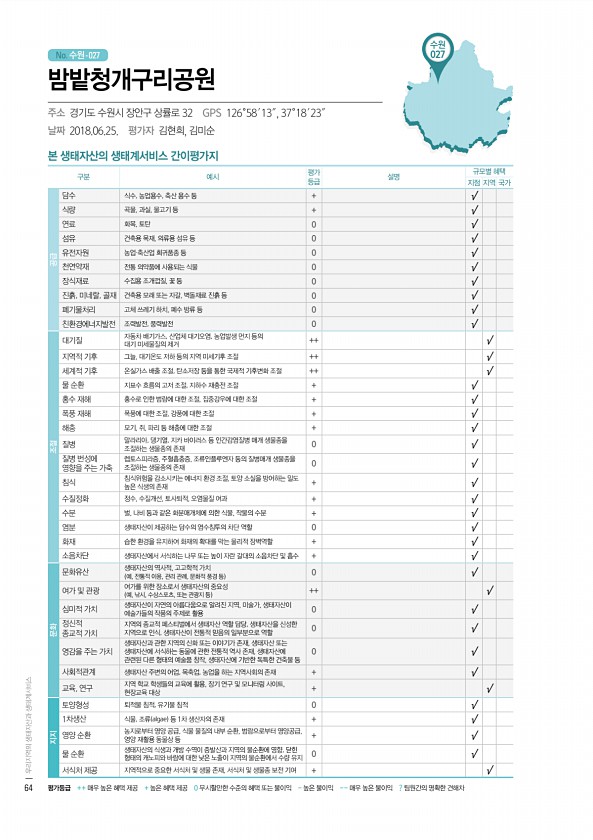 No. 수원- 수원 027 본 생태자산의 생태계서비스 간이평가지 구분 예시 평가 등급 설명 규모별 혜택 지점 지역 국가 공급 담수 식수, 농업용수, 축산 용수 등 + √ 식량 곡물, 과실, 물고기 등 + √ 연료 화목, 토탄 0 √ 섬유 건축용 목재, 의류용 섬유 등 0 √ 유전자원 농업·축산업 희귀품종 등 0 √ 천연약재 전통 의약품에 사용되는 식물 0 √ 장식재료 수집용 조개껍질, 꽃 등 0 √ 진흙, 미네랄, 골재 건축용 모래 또는 자갈, 벽돌재료 진흙 등 0 √ 폐기물처리 고체 쓰레기 하치, 폐수 방류 등 0 √ 친환경에너지발전 조력발전, 풍력발전 0 √ 조절 대기질 자동차 배기가스, 산업체 대기오염, 농업발생 먼지 등의 대기 미세물질의 제거 ++ √ 지역적 기후 그늘, 대기온도 저하 등의 지역 미세...