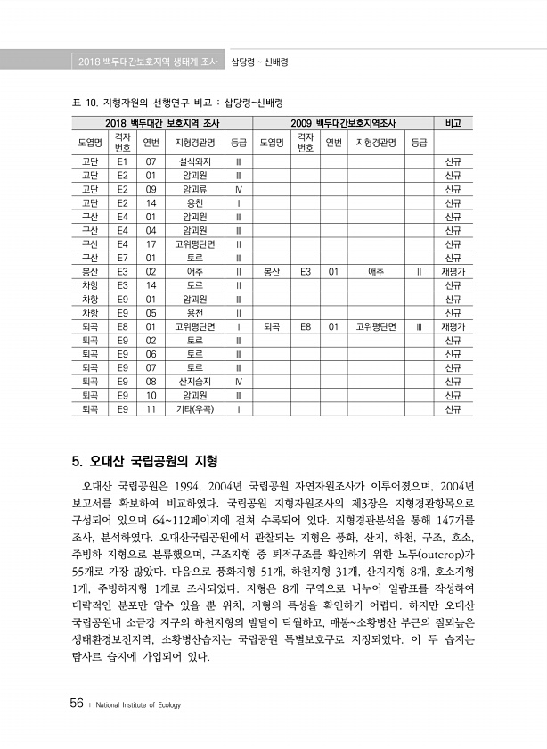 2018 백두대간보호지역 생태계 조사 삽당령 신배령 56 ? National Institute of Ecology 2018 백두대간 보호지역 조사 2009 백두대간보호지역조사 비고 도엽명 격자 번호 연번 지형경관명 등급 도엽명 격자 번호 연번 지형경관명 등급 고단 E1 07 설식와지 Ⅲ 신규 고단 E2 01 암괴원 Ⅲ 신규 고단 E2 09 암괴류 Ⅳ 신규 고단 E2 14 용천 Ⅰ 신규 구산 E4 01 암괴원 Ⅲ 신규 구산 E4 04 암괴원 Ⅲ 신규 구산 E4 17 고위평탄면 Ⅱ 신규 구산 E7 01 토르 Ⅲ 신규 봉산 E3 02 애추 Ⅱ 봉산 E3 01 애추 Ⅱ 재평가 차항 E3 14 토르 Ⅱ 신규 차항 E9 01 암괴원 Ⅲ 신규 차항 E9 05 용천 Ⅱ 신규 퇴곡 E8 01 고위평탄면 Ⅰ 퇴곡 E8 01 ...