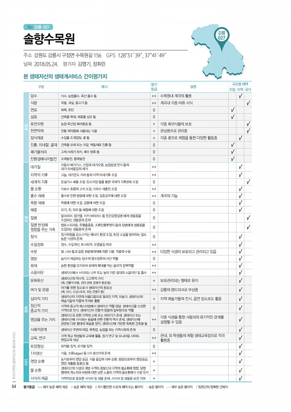 No. 강릉- 강릉 027 본 생태자산의 생태계서비스 간이평가지 구분 예시 평가 등급 설명 규모별 혜택 지점 지역 국가 공급 담수 식수, 농업용수, 축산 용수 등 ++ 수목원내 계곡의 활용 √ 식량 곡물, 과실, 물고기 등 ++ 계곡내 각종 어류 서식 √ 연료 화목, 토탄 0 √ 섬유 건축용 목재, 의류용 섬유 등 0 √ 유전자원 농업·축산업 희귀품종 등 + 각종 희귀식물의 보호 √ 천연약재 전통 의약품에 사용되는 식물 + 관상용으로 관리중 √ 장식재료 수집용 조개껍질, 꽃 등 + 각종 꽃으로 체험을 통한 다양한 활동중 √ 진흙, 미네랄, 골재 건축용 모래 또는 자갈, 벽돌재료 진흙 등 0 √ 폐기물처리 고체 쓰레기 하치, 폐수 방류 등 0 √ 친환경에너지발전 조력발전, 풍력발전 0 √ 조절 대기질 자동차 ...