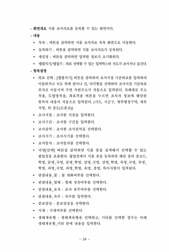 54 화면개요 식물 조사자료를 등록할 수 있는 화면이다. 내용 ? 목록 버튼을 클릭하면 식물 조사자료 목록 화면으로 이동한다. ? 등록하기 버튼을 클릭하면 식물 조사자료가 등록된다. ? 재설정 버튼을 클릭하면 입력한 정보가 초기화된다. ? 맵펼치기/맵접기 좌표 선택할 수 있는 입력박스와 지도가 보이거나 숨긴다. 항목설명 ? 좌표 선택 [맵펼치기] 버튼을 클릭하여 조사지점 기준좌표를 입력하여 이동하거나 지도 위에 핀이나 선, 다각형을 선택하여 조사지점 기준좌표 위치로 이동시켜 주면 지번주소가 자동으로 입력된다. 차례대로 주소 적용, 도엽명적용, 좌표적용 버튼을 누르면 조사자 정보에 해당된 항목의 내용이 자동으로 입력된다. 시도, 시군구, 세부행정구역, 세부 지명, 위·경도 도분초 ? 조사지점 조사한 지점을 입...