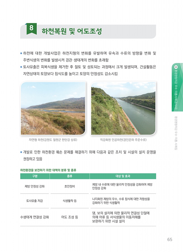 65 환경영향저감 우수·미흡사례 공사시 환경영향저감 우수·미흡 사례집 ● 하천에 대한 개발사업은 하천지형의 변화를 유발하며 유속과 수류의 방향을 변화 및 주변식생의 변화를 발생시켜 경관·생태계의 변화를 초래함 ● 토사유출은 피복식생을 제거한 후 절토 및 성토되는 과정에서 크게 발생되며, 건설활동은 자연상태의 토양보다 침식도를 높이고 토양의 안정성도 감소시킴 ● 개발로 인한 하천환경 훼손 문제를 해결하기 위해 다음과 같은 조치 및 시설의 설치 운영을 권장하고 있음 자연형 하천 강원도 철원군 한탄강 상류 직강화된 인공하천 경인운하 주운수로 구분 종류 대상 및 효과 제방 안정성 강화 호안정비 제방 내 수류에 대한 물리적 안정성을 강화하여 제방 안정성 강화 토사유출 저감 식생활착 등 나지화된 제방의 우수, 수류 침...