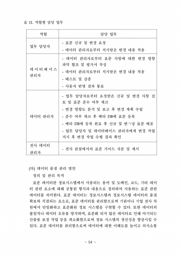 표 11. 역할별 담당 업무 역할 담당 업무 업무 담당자 표준 신규 및 변경 요청 데이터 관리자로부터 지시받은 변경 내용 적용 데 이 터 베 이 스 관리자 데이터 관리자로부터 표준 사항에 대한 변경 영향 파악 협조 및 평가서 작성 데이터 관리자로부터 지시받은 변경 내용 적용 테스트 및 검증 사용자 반영 결과 통보 데이터 관리자 업무 담당자로부터 요청받은 신규 및 변경 사항 검 토 및 표준 준수 여부 체크 변경 영향도 분석 및 보고 후 변경 계획 수립 준수 여부 체크 후 메타 DB에 표준 등록 메타 DB에 등록 완료 후 신규 및 변ㄱ녕 표준 배포 업무 담당자 및 데이터베이스 관리자에게 변경 작업 지시 후 변경 작업 수행 결과 확인 전사 데이터 관리자 전사 관점에서의 표준 가이드 자문 및 제시 다 데이터 품질 ...