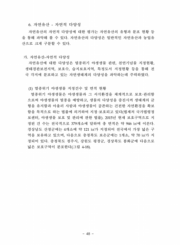 48 자연유산 자연적 다양성 자연유산의 자연적 다양성에 대한 평가는 자연유산의 유형과 분포 현황 등 을 통해 파악해 볼 수 있다 자연유산의 다양성은 일반적인 자연유산과 농업유 산으로 크게 구분할 수 있다 가 자연유산 자연적 다양성 자연유산에 대한 다양성은 멸종위기 야생생물 관련 천연기념물 지정현황 생태경관보전지역 보호수 습지보호지역 특정도서 지정현황 등을 통해 전 국 각지에 분포하고 있는 자연생태계의 다양성을 파악하는데 주력하였다 멸종위기 야생생물 지정건수 및 면적 현황 멸종위기 야생생물은 야생생물과 그 서식환경을 체계적으로 보호 관리함 으로써 야생생물의 멸종을 예방하고 생물의 다양성을 증진시켜 생태계의 균 형을 유지함과 아울러 사람과 야생생물이 공존하는 건전한 자연환경을 확보 함을 목적으로 하는 법률에 의...