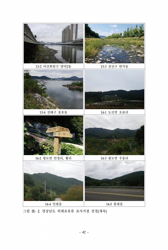 13-2 마산회원구 양덕2동 13-3 성산구 반지동 13-4 진해구 풍호동 14-1 도산면 오륜리 14-2 광도면 안정리, 황리 14-3 광도면 우동리 14-4 인평동 14-5 봉평동 그림 Ⅲ- 2. 경상남도 외래포유류 조사지점 전경 계속 42