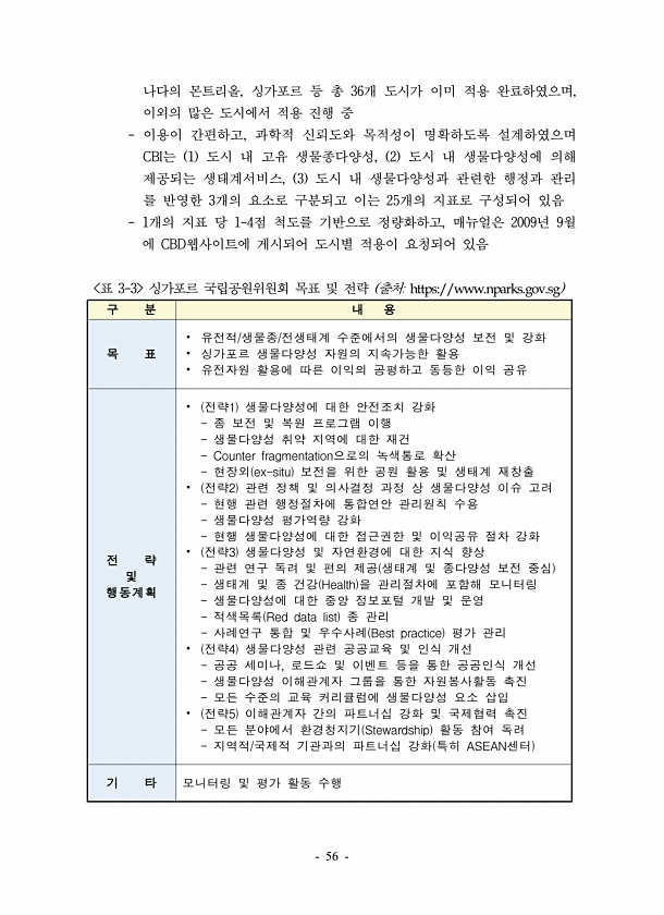 56 나다의 몬트리올, 싱가포르 등 총 36개 도시가 이미 적용 완료하였으며, 이외의 많은 도시에서 적용 진행 중 이용이 간편하고, 과학적 신뢰도와 목적성이 명확하도록 설계하였으며 CBI는 1 도시 내 고유 생물종다양성, 2 도시 내 생물다양성에 의해 제공되는 생태계서비스, 3 도시 내 생물다양성과 관련한 행정과 관리 를 반영한 3개의 요소로 구분되고 이는 25개의 지표로 구성되어 있음 1개의 지표 당 1-4점 척도를 기반으로 정량화하고, 매뉴얼은 2009년 9월 에 CBD웹사이트에 게시되어 도시별 적용이 요청되어 있음 표 3-3 싱가포르 국립공원위원회 목표 및 전략 출처https//www.nparks.gov.sg 구 분 내 용 목 표 ? 유전적/생물종/전생태계 수준에서의 생물다양성 보전 및 강화 ? 싱가포...