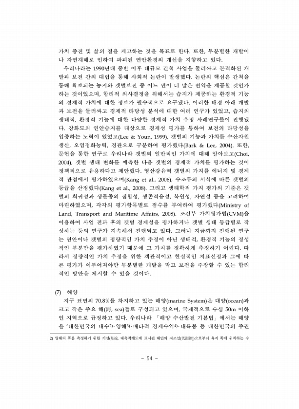 54 가치 증진 및 삶의 질을 제고하는 것을 목표로 한다 또한 무분별한 개발이 나 자연재해로 인하여 파괴된 연안환경의 개선을 지향하고 있다 우리나라는 년대 중반 이후 대규모 간척 사업을 둘러싸고 본격화된 개 발과 보전 간의 대립을 통해 사회적 논란이 발생했다 논란의 핵심은 간척을 통해 확보되는 농지와 갯벌보전 중 어느 편이 더 많은 편익을 제공할 것인가 하는 것이었으며 합리적 의사결정을 위해서는 습지가 제공하는 환경적 기능 의 경제적 가치에 대한 정보가 필수적으로 요구됐다 이러한 배경 아래 개발 과 보전을 둘러싸고 경제적 타당성 분석에 대한 여러 연구가 있었고 습지의 생태적 환경적 기능에 대한 다양한 경제적 가치 추정 사례연구들이 진행됐 다 강화도의 연안습지를 대상으로 경제성 평가를 통하여 보전의 타당성을 ...