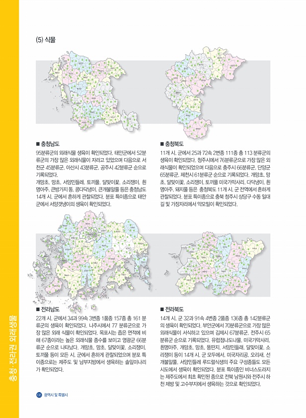 충청?전라권 외래생물 68 광역시 및 특별시 5 식물 ■ 전라남도 22개 시, 군에서 34과 99속 3변종 1품종 157종 총 161 분 류군의 생육이 확인되었다. 나주시에서 77 분류군으로 가 장 많은 외래 식물이 확인되었다. 목포시는 좁은 면적에 비 해 67종이라는 높은 외래식물 종수를 보이고 영광군 66분 류군 순으로 나타났다. 개망초, 망초, 달맞이꽃, 소리쟁이, 토끼풀 등이 모든 시, 군에서 흔하게 관찰되었으며 분포 특 이종으로는 제주도 및 남부지방에서 생육하는 솔잎미나리 가 확인되었다. ■ 충청북도 11개 시, 군에서 25과 72속 2변종 111종 총 113 분류군의 생육이 확인되었다. 청주시에서 76분류군으로 가장 많은 외 래식물이 확인되었으며 다음으로 충주시 66분류군, 단양군 65분류군, 제...