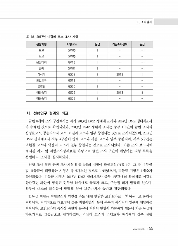 Ⅱ. 조사결과 www.nie.re.kr ? 55 관찰지형 지형코드 등급 기존조사정보 등급 토르 GM05 Ⅲ 토르 GM05 Ⅲ 용암대지 GV13 Ⅱ 급애 GM01 Ⅲ 하식애 GS08 Ⅰ 2013 Ⅰ 포인트바 GS13 Ⅱ 범람원 GS30 Ⅲ 하천습지 GS22 Ⅱ 2013 Ⅱ 하천습지 GS22 Ⅰ 표 18. 2017년 이길리 코스 조사 지형 나. 선행연구 결과와 비교 금번 8개의 조사 구간에서는 과거 2013년 DMZ 생태계 조사와 2014년 DMZ 생태계조사 가 수행된 것으로 확인되었다. 2013년 DMZ 생태계 조사는 중부 1구간이 금번 조사의 산명호코스, 동송저수지 코스, 이길리 코스와 일부 중첩되는 것으로 조사되었으며, 2014년 DMZ 생태계조사 서부 4구간이 빙애 코스와 사동 코스와 일부 중첩되며, 서...