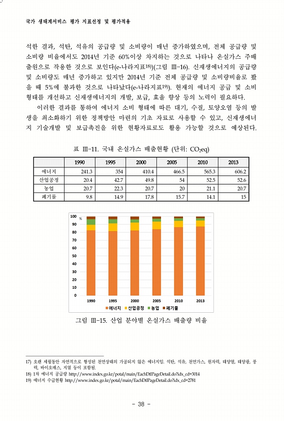 국가 생태계서비스 평가 지표선정 및 평가적용 38 석한 결과, 석탄, 석유의 공급량 및 소비량이 매년 증가하였으며, 전체 공급량 및 소비량 비율에서도 2014년 기준 60%이상 차지하는 것으로 나타나 온실가스 주배 출원으로 작용한 것으로 보인다 e-나라지표18 그림 Ⅲ 16 신재생에너지의 공급량 및 소비량도 매년 증가하고 있지만 2014년 기준 전체 공급량 및 소비량비율로 봤 을 때 5%에 불과한 것으로 나타났다 e-나라지표19 현재의 에너지 공급 및 소비 형태를 개선하고 신재생에너지의 개발, 보급, 효율 향상 등의 노력이 필요하다. 이러한 결과를 통하여 에너지 소비 형태에 따른 대기, 수질, 토양오염 등의 발 생을 최소화하기 위한 정책방안 마련의 기초 자료로 사용할 수 있고, 신재생에너 지 기술개발 및 보...