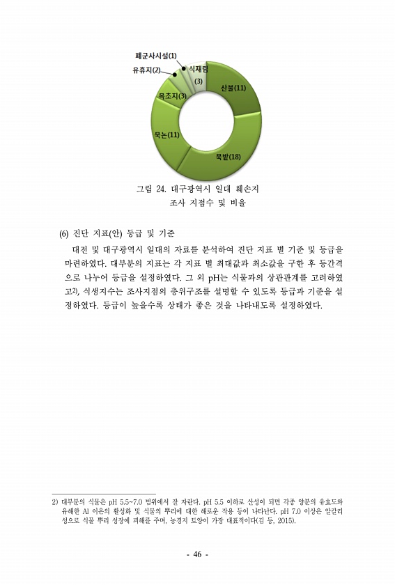 그림 24. 대구광역시 일대 훼손지 조사 지점수 및 비율 6 진단 지표 안 등급 및 기준 대전 및 대구광역시 일대의 자료를 분석하여 진단 지표 별 기준 및 등급을 마련하였다. 대부분의 지표는 각 지표 별 최대값과 최소값을 구한 후 등간격 으로 나누어 등급을 설정하였다. 그 외 pH는 식물과의 상관관계를 고려하였 고2 , 식생지수는 조사지점의 층위구조를 설명할 수 있도록 등급과 기준을 설 정하였다. 등급이 높을수록 상태가 좋은 것을 나타내도록 설정하였다. 2 대부분의 식물은 pH 5.57.0 범위에서 잘 자란다. pH 5.5 이하로 산성이 되면 각종 양분의 유효도와 유해한 Al 이온의 활성화 및 식물의 뿌리에 대한 해로운 작용 등이 나타난다. pH 7.0 이상은 알칼리 성으로 식물 뿌리 성장에 피해를 주며, ...
