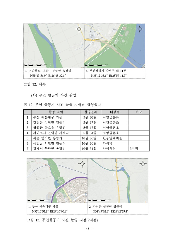 42 3. 전라북도 김제시 부량면 옥정리 N35˚43´56.9˝ E126˚48´32.1˝ 4. 부산광역시 강서구 대저1동 N35˚12´35.1˝ E128˚59´11.9˝ 그림 12. 계속 아 무인 항공기 사진 촬영 촬영 지역 촬영일자 대상종 비고 1 부산 해운대구 좌동 5월 06일 서양금혼초 2 강진군 성전면 영풍리 5월 17일 서양금혼초 3 영암군 삼호읍 용당리 5월 17일 서양금혼초 4 서귀포시 안덕면 사계리 5월 31일 서양금혼초 5 세종 연서면 봉암리 10월 30일 단풍잎돼지풀 6 옥천군 이원면 원동리 10월 30일 가시박 7 김제시 부량면 옥정리 10월 31일 양미역취 3지점 표 12. 무인 항공기 사진 촬영 지역과 촬영일자 1. 부산 해운대구 좌동 N35˚10´52.1˝ E129˚10´00.4˝ ...